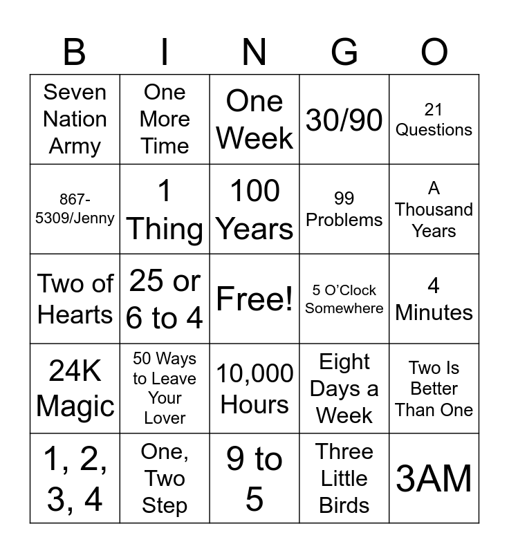 This bingo card has a free space and 39 words: 1985, 12:51, 22, 1 Thing, 1, 2, 3, 4, 10,000 Hours, 100 Years, A Thousand Miles, 21 Questions, 24K Magic, 25 or 6 to 4, 30/90, 3AM, 4 Minutes, 5 O’Clock Somewhere, 50 Ways to Leave Your Lover, I'm Gonna Be (500 Miles), Seven Nation Army, 7 Rings, Eight Days a Week, 867-5309/Jenny, 9 to 5, 99 Problems, A Thousand Years, If I Had $1,000,000, If You Had My Love (Remix 2), Million Reasons, One Call Away, One Less Lonely Girl, One More Time, One Thing, One Way or Another, One Week, One, Two Step, Three Little Birds, Three Times a Lady, Two Is Better Than One, Two of Hearts and Two Princes.