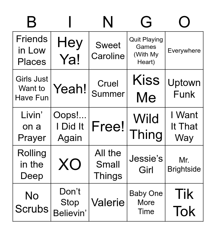 This bingo card has a free space and 26 words: All the Small Things, Baby One More Time, Cruel Summer, Don’t Stop Believin’, Everywhere, Friends in Low Places, Girls Just Want to Have Fun, Hey Ya!, I Want It That Way, Jessie’s Girl, Kiss Me, Livin’ on a Prayer, Mr. Brightside, No Scrubs, Oops!... I Did It Again, Party in the U.S.A., Quit Playing Games (With My Heart), Rolling in the Deep, Sweet Caroline, Tik Tok, Uptown Funk, Valerie, Wild Thing, XO, Yeah! and Zombie.
