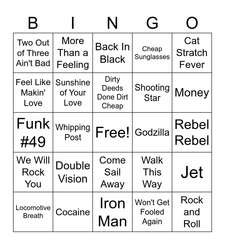 This bingo card has a free space and 43 words: Barracuda, Rock and Roll, Free Bird, Locomotive Breath, Crazy Train, Won't Get Fooled Again, Back In Black, Black Dog, Cat Stratch Fever, Cocaine, Cheap Sunglasses, Godzilla, Come Sail Away, Double Vision, Heartbreaker, Iron Man, Life In the Fast Lane, Funk #49, Live and Let Die, Money, More Than a Feeling, No More Mr. Nice Guy, Smoke on the Water, Two Out of Three Ain't Bad, Rock and Roll All Night, Rebel Rebel, Stay With Me, T.N.T., Walk This Way, We Will Rock You, We're An American Band, Jet, Wheel in the Sky, Whipping Post, All Right Now, You Really Got Me, Immigrant Song, Dirty Deeds Done Dirt Cheap, Feel Like Makin' Love, Shooting Star, Gimmie Three Steps, Sunshine of Your Love and Roundabout.