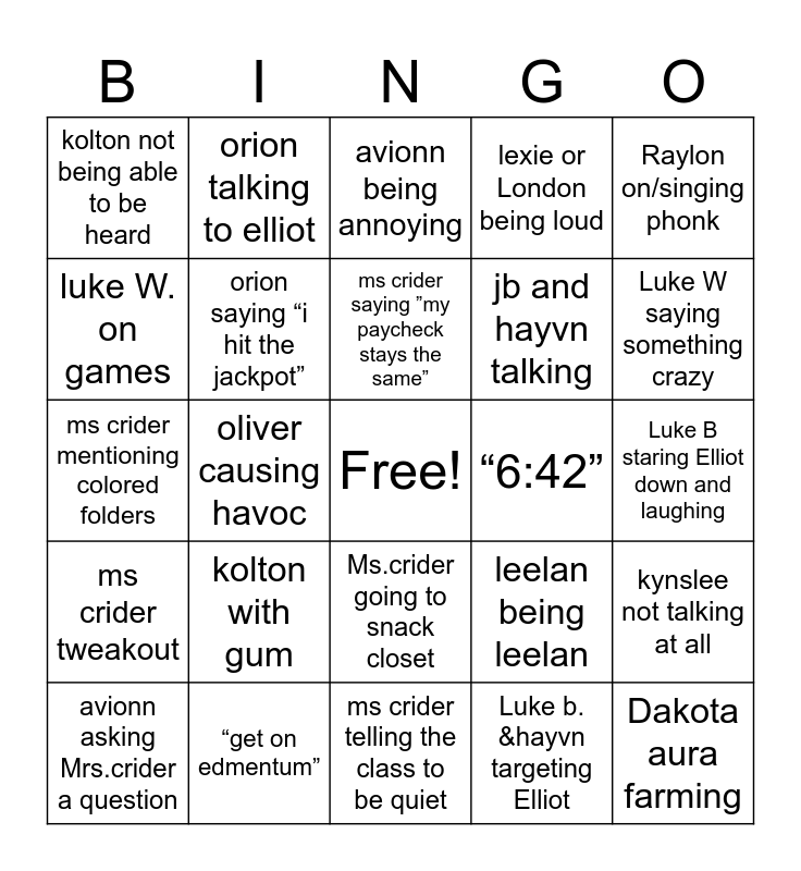 This bingo card has a free space and 24 words: kolton with gum, “get on edmentum”, ms crider saying ”my paycheck stays the same”, avionn asking Mrs.crider a question, Raylon on/singing phonk, kolton not being able to be heard, luke W. on games, orion talking to elliot, “6:42”, Ms.crider going to snack closet, jb and hayvn talking, ms crider mentioning colored folders, leelan being leelan, kynslee not talking at all, orion saying “i hit the jackpot”, Luke b. &hayvn targeting Elliot, Luke B staring Elliot down and laughing, avionn being annoying, Luke W saying something crazy, oliver causing havoc, Dakota aura farming, ms crider tweakout, lexie or London being loud and ms crider telling the class to be quiet.