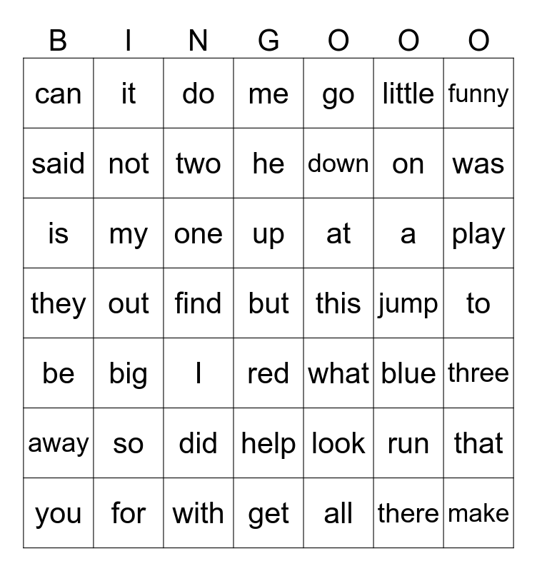 This bingo card has 63 words: the, to, and, a, I, you, it, in, said, for, up, look, is, go, we, little, down, can, see, not, one, my, me, big, come, blue, red, where, jump, away, here, help, make, yellow, two, play, run, find, three, funny, he, was, that, she, on, they, but, at, with, all, there, out, be, have, am, do, did, what, so, get, like, this and will.