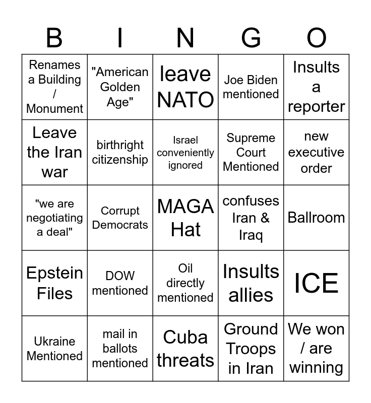 This bingo card has a free space and 24 words: DOW mentioned, mail in ballots mentioned, Israel conveniently ignored, Ukraine Mentioned, Insults a reporter, Renames a Building / Monument, Leave the Iran war, "American Golden Age", confuses Iran & Iraq, Oil directly mentioned, Supreme Court Mentioned, "we are negotiating a deal", Insults allies, ICE, birthright citizenship, Ground Troops in Iran, Ballroom, leave NATO, new executive order, Corrupt Democrats, We won / are winning, Epstein Files, Joe Biden mentioned and Cuba threats.