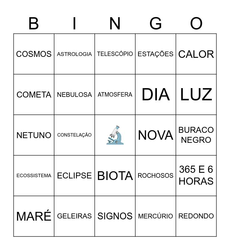 This bingo card has a free space and 64 words: 🧪, ⚗, 🧬, 365 E 6 HORAS, ABIÓTICO, ASTERÓIDE, ASTROLOGIA, ASTRONOMIA, ATMOSFERA, BIG BANG, BIOTA, BIÓTICO, BURACO NEGRO, CALOR, CHEIA, COMETA, CONSTELAÇÃO, COSMOS, CRESCENTE, DIA, ECLIPSE, ECOSSISTEMA, ESTAÇÕES, ESTRELA, EXPANSÃO, FASES, GALÁXIAS, GASES, GASOSOS, GRAVIDADE, HIDROSFERA, JÚPITER, LITOSFERA, LUA, LUZ, MARÉ, MARTE, MERCÚRIO, MINGUANTE, NEBULOSA, NETUNO, NOVA, ÓRBITA, OXIGÊNIO, PLANETAS, REDONDO, GELEIRAS, ROCHAS, ROCHOSOS, ROTAÇÃO, SATÉLITE, SATURNO, SIGNOS, SISTEMA SOLAR, SOL, SOLO, TELESCÓPIO, TERRA, TRANSLAÇÃO, UNIVERSO, URANO, VENUS, VIA LÁCTEA and VIDA.