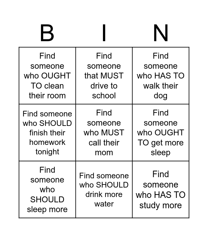 This bingo card has a free space and 8 words: Find someone who OUGHT TO get more sleep, Find someone who HAS TO walk their dog, Find someone that MUST drive to school, Find someone who SHOULD sleep more, Find someone who OUGHT TO clean their room, Find someone who HAS TO study more, Find someone who SHOULD finish their homework tonight and Find someone who SHOULD drink more water.