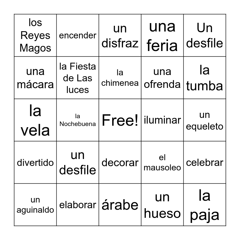 This bingo card has a free space and 75 words: una feria, Felix Hanuka!, un disfraz, patronal, la tumba, una fiesta, la menora, una ofrenda, un hueso, undisfraz, decorar, un aguinaldo, la chimenea, una mácara, Hanuka, la Nochebuena, enterrado, la paja, el camella, Un desfile, hebreo/a, la vela, la Fiesta de Las luces, encender, una feria, una fiesta, el Santo pátron / la Santa patrons, una procesión, patronal, desfilar, caminar, los muertos, el camosanto, el cementerio, el mausoleo, la tumba, una ofrenda, una corona de Flores, una calaera, un cráneo, un equeleto, un hueso, un disfraz, una máscara, enterrado, la Navidad, as Navidades, la Nochebuena, la chimenea, un aguinaldo, los Reyes Magos, el camello, la paja, el árbol de Navidad, decorar, Hanuka, Feliz Hanuka!, la fieSta de lasluces, la menora, la vela, judío/a, hebreo/a, engender, un desfile, una banda municipal, los fuegos artifciales, el cielo, bailar, iluminar, el bizcocho, todo el Mundo, dulce, celebrar, divertido, elaborar, mientras, árabe and musulmán.