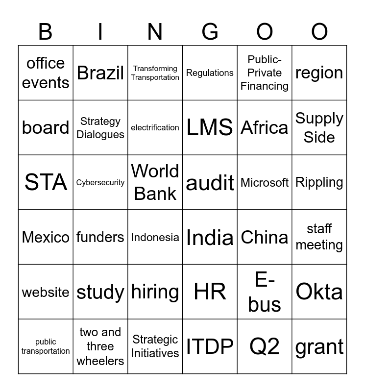 This bingo card has 36 words: HR, hiring, ITDP, board, Mexico, audit, Strategy Dialogues, Strategic Initiatives, Public-Private Financing, E-bus, Supply Side, Regulations, Okta, Cybersecurity, LMS, office events, website, Microsoft, STA, Transforming Transportation, World Bank, funders, India, Indonesia, China, Brazil, Africa, two and three wheelers, electrification, region, grant, public transportation, staff meeting, Rippling, study and Q2.