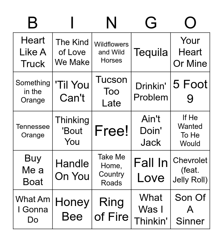 This bingo card has a free space and 60 words: Rain Is A Good Thing, Honey Bee, Night Shift, Buy Me a Boat, What Was I Thinkin', 23, 'Til You Can't, All Your'n, Drinkin' Problem, When It Rains It Pours, Tequila, Whiskey Glasses, Something in the Orange, Fast Car, County Line, Heart Like A Truck, Son Of A Sinner, Your Heart Or Mine, Pretty Little Poison, Tucson Too Late, Ain't Doin' Jack, Wildflowers and Wild Horses, What Am I Gonna Do, Chevrolet (feat. Jelly Roll), Thank God, What My World Spins Around, What He Didn't Do, I Quit Drinking, 5 Foot 9, I Remember Everything, Next Thing You Know, Outskirts, I'm Not Pretty, Country Boy's Dream Girl, The Kind of Love We Make, Pour Me A Drink, Whiskey On You, Thinking 'Bout You, Painted You Pretty, Tennessee Orange, Watermelon Moonshine, Handle On You, If He Wanted To He Would, Dancin’ In The Country, Fall In Love, Wanted, Don't That Sound Like Her, Mamas Don't Let Your Babies Grow up to Be Cowboys, As Long As You'll Stay, Take Me Home, Country Roads, Ring of Fire, Two Dozen Roses, Song of the South, This Is How We Roll, No Shoes, No Shirt, No Problems, Watching You, Homegrown, Long Hot Summer, If You're Gonna Play in Texas (You Gotta Have a Fiddle in the Band) and Hey, Good Lookin'.
