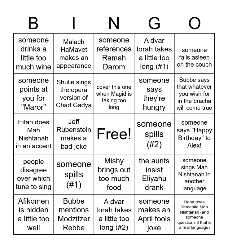 This bingo card has a free space and 24 words: someone spills (#1), Bubbe mentions Modzitzer Rebbe, cover this one when Magid is taking too long, Afikomen is hidden a little too well, someone falls asleep on the couch, someone drinks a little too much wine, someone points at you for "Maror", Malach HaMavet makes an appearance, someone spills (#2), Mishy brings out too much food, someone says they're hungry, Eitan does Mah Nishtanah in an accent, the aunts insist Eliyahu drank, someone sings Mah Nishtanah in another language, Shulie sings the opera version of Chad Gadya, someone makes an April fools joke, someone says "Happy Birthday" to Alex!, someone references Ramah Darom, Bubbe says that whatever you wish for in the bracha will come true, Jeff Rubenstein makes a bad joke, Rena does Yemenite Mah Nishtanah (and someone questions if that is a real language), people disagree over which tune to sing, A dvar torah takes a little too long (#1) and A dvar torah takes a little too long (#2).