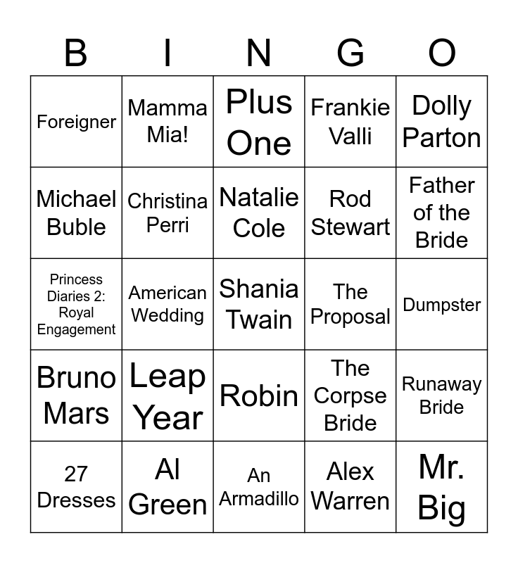 This bingo card has 60 words: She & Him, Al Green, Cat Power, Bruno Mars, Alex Warren, Ed Sheeran, Christina Perri, Jason Mraz, Rod Stewart, Ray Charles, Frankie Valli, Lily Allen, Michael Buble, Seal, Coldplay, Foreigner, Shania Twain, Dolly Parton, Hall & Oates, Natalie Cole, The Proposal, Plus One, 27 Dresses, Runaway Bride, My Best Friend’s Wedding, Bride Wars, Bridesmaids, Ready or Not, Father of the Bride, Wedding Crashers, The Wedding Planner, The Wedding Singer, My Big Fat Greek Wedding, The Twilight Saga: Breaking Dawn Part 1, Mamma Mia!, Crazy Rich Asians, Four Weddings and a Funeral, American Wedding, Palm Springs, Princess Diaries 2: Royal Engagement, The Princess Bride, Leap Year, Dumpster, The Graduate, The Corpse Bride, Wilson Phillips, Niagara Falls, Kate Middleton, Ron Swanson, Robin, An Armadillo, Daniel Craig, Stephen Moyer, Anna Paquin, Rachel, The Red Wedding, Meredith Grey, Derek Shepherd, Mr. Big and David Rose.