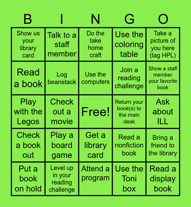 This bingo card has a free space and 28 words: Bring a friend to the library, Attend a program, Join a reading challenge, Use the Toni box, Read a book, Do the take home craft, Talk to a staff member, Check a book out, Return your book(s) to the main desk, Put a book on hold, Play with the Legos, Use the coloring table, Level up in your reading challenge, Attend a program, Show a staff member your favorite book, Use the book trolley, Play a board game, Log beanstack, Use the computers, Get a library card, Show us your library card, Roll-a-Read, Read a display book, Check out a movie, Ask about ILL, Read a nonfiction book, Take a picture of you here (tag HPL) and Tell us why you love the library.