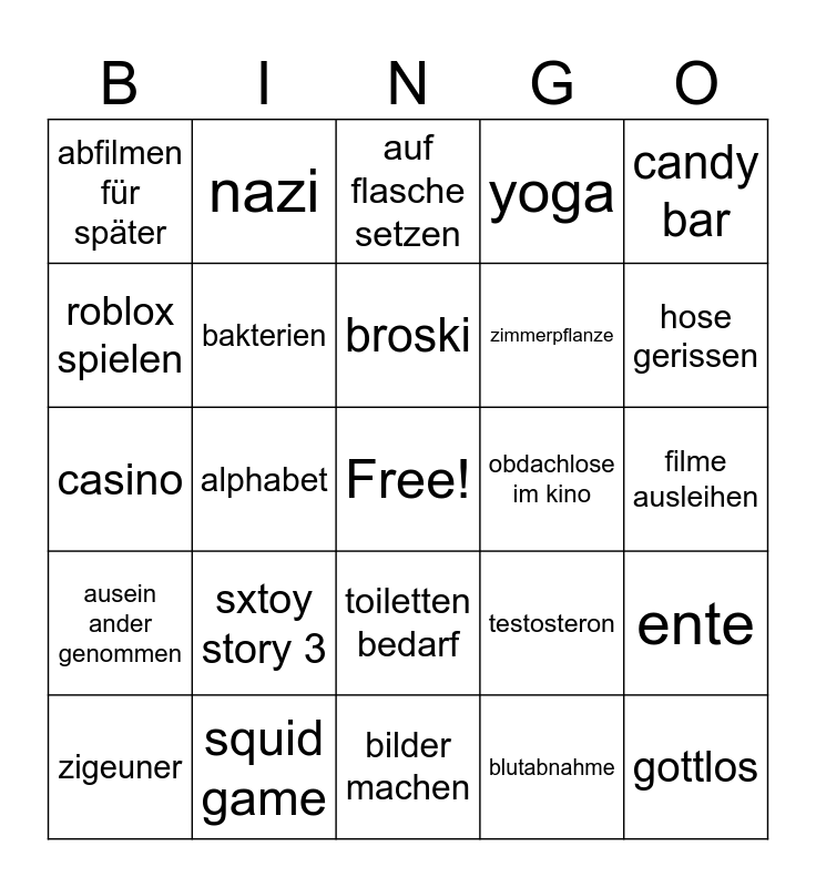 This bingo card has a free space and 24 words: sxtoy story 3, squid game, broski, zigeuner, candy bar, abfilmen für später, roblox spielen, nazi, obdachlose im kino, toiletten bedarf, zimmerpflanze, casino, testosteron, ente, bakterien, blutabnahme, filme ausleihen, auf flasche setzen, hose gerissen, alphabet, gottlos, ausein ander genommen, yoga and bilder machen.
