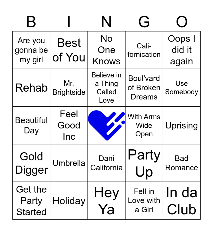 This bingo card has a free space and 50 words: Crazy in Love, In da Club, Party in the USA, Hey Ya, Umbrella, Hot in Herre, Best of You, Hollaback Girl, Rehab, This Love, Mr. Brightside, Cali-fornication, Bad Romance, Party Up, Tik Tok, Cry me a River, Believe in a Thing Called Love, With Arms Wide Open, All the Small Things, Oops I did it again, Feel Good Inc, Fell in Love with a Girl, Are you gonna be my girl, Boul'vard of Broken Dreams, Kryptonite, Welcome to the Black Parade, Use Somebody, Seven Nation Army, No One Knows, Dani California, Bring Me to Life, Float On, Hanging by a Moment, Like a Stone, Holiday, The Middle, I'm Yours, SexyBack, Poker Face, Uprising, Boom Boom Pow, Paper Planes, I Write Sins Not Tragedies, I Kissed a Girl, Get the Party Started, Beautiful Day, Sugar, We're Goin' Down, Yeah!, Gold Digger and Hips Dont Lie.