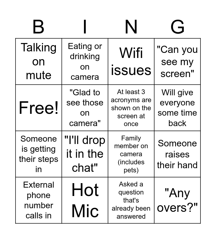 This bingo card has 16 words: Hot Mic, Someone raises their hand, Wifi issues, Talking on mute, Someone is getting their steps in, Eating or drinking on camera, Family member on camera (includes pets), Asked a question that's already been answered, Free!, "Glad to see those on camera", External phone number calls in, "Can you see my screen", "I'll drop it in the chat", Will give everyone some time back, At least 3 acronyms are shown on the screen at once and "Any overs?".