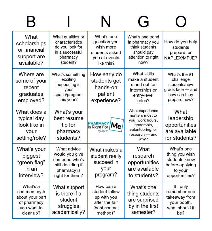This bingo card has a free space and 26 words: What makes a student really succeed in your program?, What’s one thing students are surprised by in the first semester?, How early do students get hands-on patient experience?, What support is there if a student struggles academically?, How do you help students prepare for NAPLEX/MPJE?, What scholarships or financial support are available?, Where are some of your recent graduates employed?, What qualities or characteristics do you look for in a successful pharmacy student?, What leadership opportunities are available for students?, What research opportunities are available to students?, What skills make a student stand out for internships or entry-level roles?, What does a typical day look like in your setting/role?, What’s one thing you wish students knew before applying to your opportunities?, What’s a common myth about your part of pharmacy you want to clear up?, What’s your best resume tip for pharmacy students?, What growth paths exist (training, leadership, specialization) in your organization?, What’s one trend in pharmacy you think students should pay attention to right now?, What’s your biggest “green flag” in an interview?, What’s one question you wish more students asked you at events like this?, If I only remember one takeaway from your booth, what should it be?, What’s the #1 challenge students/new grads face — and how can they prepare now?, How can a student follow up with you after the fair (best contact method)?, What experience matters most to you: work hours, leadership, volunteering, or research — and why?, What advice would you give someone who’s still deciding if pharmacy is right for them?, What’s something exciting happening in your space/program this year? and What’s a “hidden gem” opportunity people overlook (program, role, pathway)?.