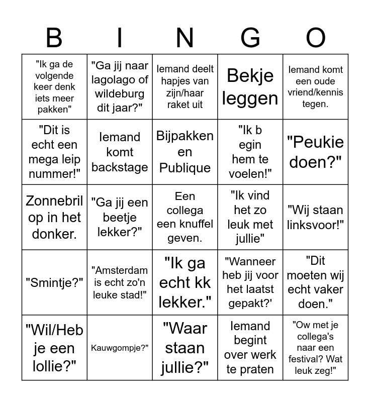 This bingo card has a free space and 35 words: Iemand trekt zijn/haar shirt uit, "Oeps, dat was iets te veel.", "Voel jij 'm al?", Iemand komt backstage, "Ik ga echt kk lekker.", Bekje leggen, "Dit is echt een mega leip nummer!", "Mag ik een hijsie?", Bijpakken en Publique, Iemand loopt rond in cowboy boots., Zonnebril op in het donker., Iemand komt een oude vriend/kennis tegen., "Oh my goooood", "Dit had ik echt niet van jou verwacht.", "Ik ga de volgende keer denk iets meer pakken", "Ik vind het zo leuk met jullie", Iemand begint over werk te praten, "Ga jij een beetje lekker?", "Smintje?", "Ow met je collega's naar een festival? Wat leuk zeg!", "Wanneer heb jij voor het laatst gepakt?', "Wil/Heb je een lollie?", "Dit moeten wij echt vaker doen.", Kauwgompje?", Iemand deelt hapjes van zijn/haar raket uit, "Peukie doen?", "Wij gaan even zitten.", "Ik vind dit echt kut muziek.", "Ik begin hem te voelen!", "Wij staan linksvoor!", "Kan je ook even water bijvullen?", "Waar staan jullie?", "Amsterdam is echt zo'n leuke stad!", "Ga jij naar lagolago of wildeburg dit jaar?" and "Deze dj draait echt lekker, wie is dit?".
