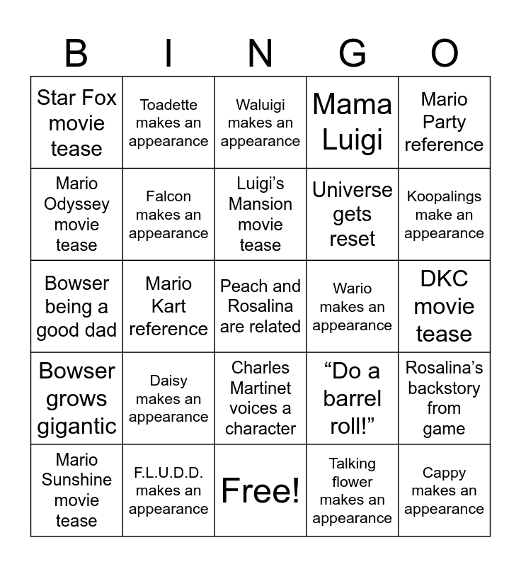 This bingo card has 25 words: Bowser grows gigantic, F.L.U.D.D. makes an appearance, Peach and Rosalina are related, Talking flower makes an appearance, Mario Party reference, Star Fox movie tease, Toadette makes an appearance, Waluigi makes an appearance, Wario makes an appearance, Rosalina’s backstory from game, Mario Odyssey movie tease, Falcon makes an appearance, Free!, “Do a barrel roll!”, Koopalings make an appearance, Mario Sunshine movie tease, Mario Kart reference, Luigi’s Mansion movie tease, Universe gets reset, DKC movie tease, Bowser being a good dad, Daisy makes an appearance, Charles Martinet voices a character, Mama Luigi and Cappy makes an appearance.