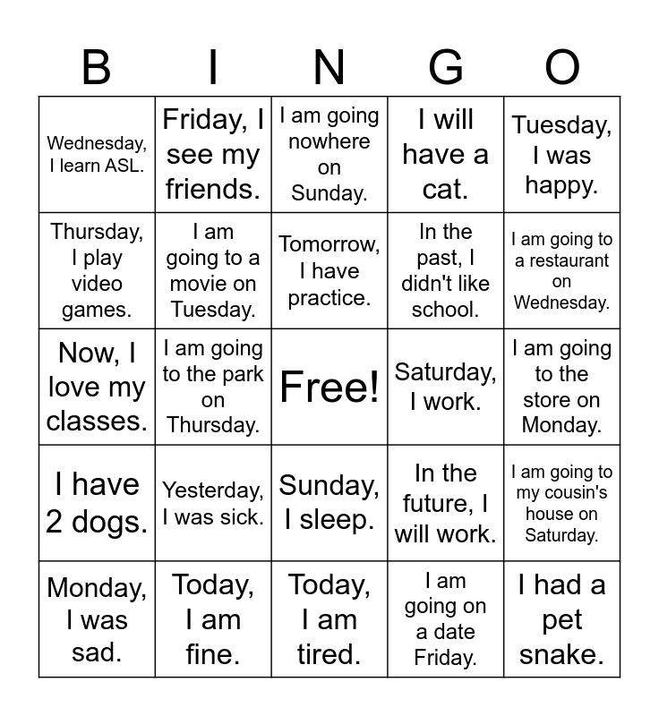 This bingo card has a free space and 24 words: Yesterday, I was sick., Today, I am fine., Tomorrow, I have practice., Monday, I was sad., Tuesday, I was happy., Wednesday, I learn ASL., Thursday, I play video games., Friday, I see my friends., Saturday, I work., Sunday, I sleep., In the past, I didn't like school., Now, I love my classes., In the future, I will work., I am going to my cousin's house on Saturday., I am going to a movie on Tuesday., I am going on a date Friday., I am going to the store on Monday., I am going nowhere on Sunday., I am going to a restaurant on Wednesday., I am going to the park on Thursday., I had a pet snake., I have 2 dogs., I will have a cat. and Today, I am tired..