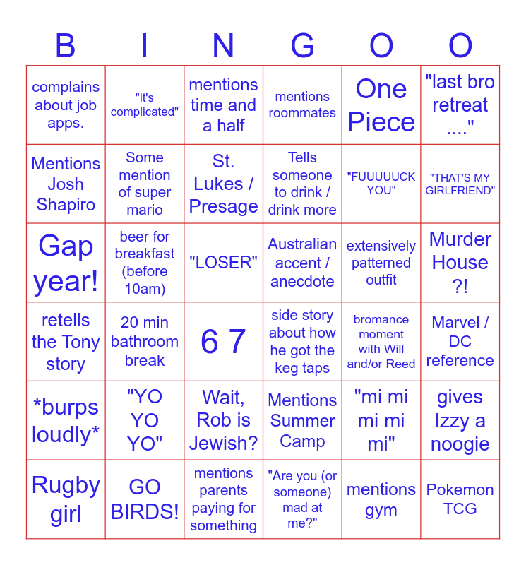 This bingo card has 36 words: Mentions Summer Camp, Wait, Rob is Jewish?, "Are you (or someone) mad at me?", Mentions Josh Shapiro, retells the Tony story, Australian accent / anecdote, Some mention of super mario, mentions parents paying for something, One Piece, "mi mi mi mi mi", "THAT'S MY GIRLFRIEND", mentions roommates, gives Izzy a noogie, beer for breakfast (before 10am), Tells someone to drink / drink more, complains about job apps., *burps loudly*, extensively patterned outfit, Gap year!, mentions time and a half, "LOSER", 20 min bathroom break, side story about how he got the keg taps, 6 7, bromance moment with Will and/or Reed, "it's complicated", "FUUUUUCK YOU", GO BIRDS!, St. Lukes / Presage, "last bro retreat ....", Pokemon TCG, Rugby girl, Marvel / DC reference, Murder House ?!, "YO YO YO" and mentions gym.