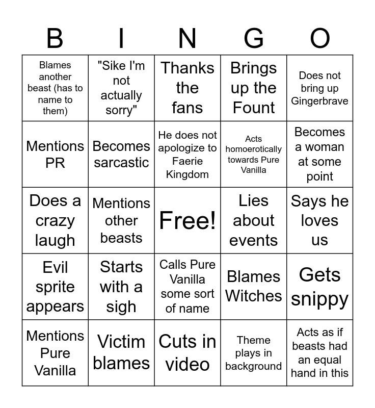 This bingo card has a free space and 24 words: Starts with a sigh, Victim blames, He does not apologize to Faerie Kingdom, Mentions Pure Vanilla, Does not bring up Gingerbrave, Blames another beast (has to name to them), Mentions PR, "Sike I'm not actually sorry", Lies about events, Calls Pure Vanilla some sort of name, Acts homoerotically towards Pure Vanilla, Does a crazy laugh, Blames Witches, Gets snippy, Becomes sarcastic, Theme plays in background, Says he loves us, Thanks the fans, Becomes a woman at some point, Mentions other beasts, Acts as if beasts had an equal hand in this, Evil sprite appears, Brings up the Fount and Cuts in video.
