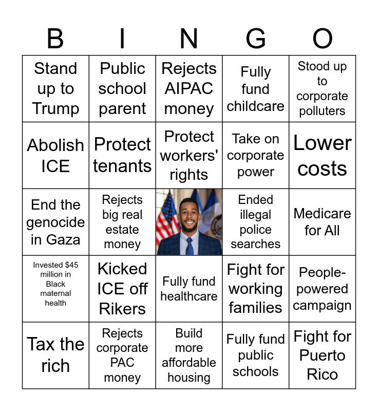 This bingo card has a free space and 24 words: Kicked ICE off Rikers, Rejects corporate PAC money, Protect workers' rights, Tax the rich, Stood up to corporate polluters, Stand up to Trump, Abolish ICE, Public school parent, Ended illegal police searches, Fully fund healthcare, Take on corporate power, End the genocide in Gaza, Fight for working families, People-powered campaign, Protect tenants, Fully fund public schools, Medicare for All, Rejects AIPAC money, Lower costs, Rejects big real estate money, Fight for Puerto Rico, Invested $45 million in Black maternal health, Fully fund childcare and Build more affordable housing.