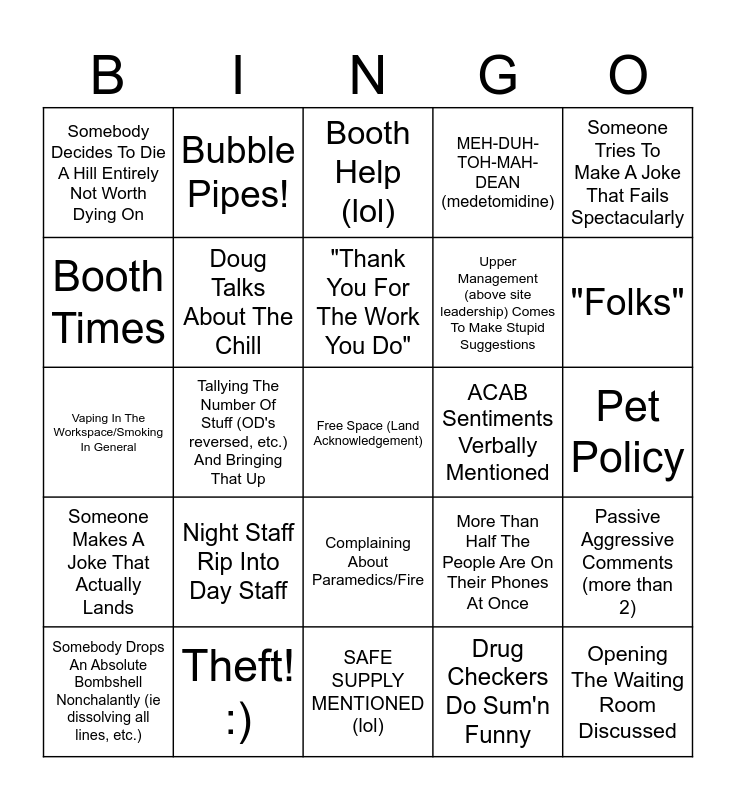 This bingo card has a free space and 24 words: Night Staff Rip Into Day Staff, Theft! :), "Thank You For The Work You Do", Somebody Drops An Absolute Bombshell Nonchalantly (ie dissolving all lines, etc.), Someone Tries To Make A Joke That Fails Spectacularly, Somebody Decides To Die A Hill Entirely Not Worth Dying On, Booth Times, Bubble Pipes!, ACAB Sentiments Verbally Mentioned, Complaining About Paramedics/Fire, Upper Management (above site leadership) Comes To Make Stupid Suggestions, Vaping In The Workspace/Smoking In General, More Than Half The People Are On Their Phones At Once, Passive Aggressive Comments (more than 2), Doug Talks About The Chill, Drug Checkers Do Sum'n Funny, Pet Policy, Booth Help (lol), "Folks", Tallying The Number Of Stuff (OD's reversed, etc.) And Bringing That Up, Opening The Waiting Room Discussed, Someone Makes A Joke That Actually Lands, MEH-DUH-TOH-MAH-DEAN (medetomidine) and SAFE SUPPLY MENTIONED (lol).