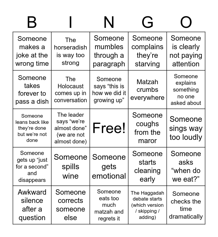 This bingo card has a free space and 24 words: Someone spills wine, Someone corrects someone else, Someone says “this is how we did it growing up”, Awkward silence after a question, Someone is clearly not paying attention, Someone makes a joke at the wrong time, Someone takes forever to pass a dish, The horseradish is way too strong, Someone coughs from the maror, Someone gets emotional, Matzah crumbs everywhere, Someone leans back like they’re done but we’re not done, Someone starts cleaning early, Someone asks “when do we eat?”, The Holocaust comes up in conversation, The Haggadah debate starts (which version / skipping / adding), Someone sings way too loudly, Someone mumbles through a paragraph, Someone explains something no one asked about, The leader says “we’re almost done” (we are not almost done), Someone checks the time dramatically, Someone gets up “just for a second” and disappears, Someone complains they’re starving and Someone eats too much matzah and regrets it.