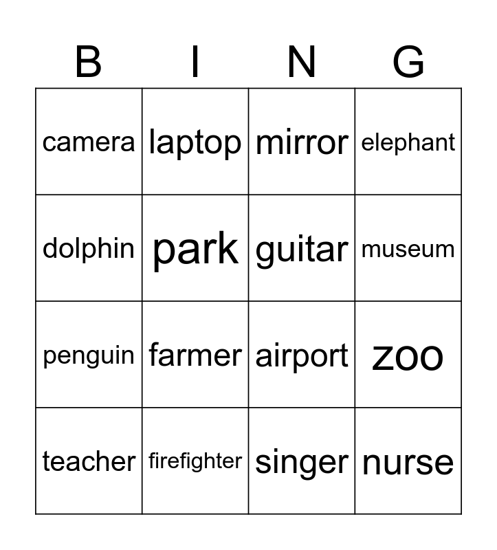 This bingo card has 48 words: ibrary, teacher, book, dog, hospital, doctor, laptop, cat, park, baker, guitar, elephant, school, police officer, phone, lion, museum, firefighter, bicycle, dolphin, zoo, chef, camera, penguin, cinema, farmer, umbrella, giraffe, restaurant, nurse, watch, tiger, beach, artist, backpack, parrot, supermarket, singer, piano, shark, gym, astronaut, mirror, rabbit, airport, writer, lamp and snake.