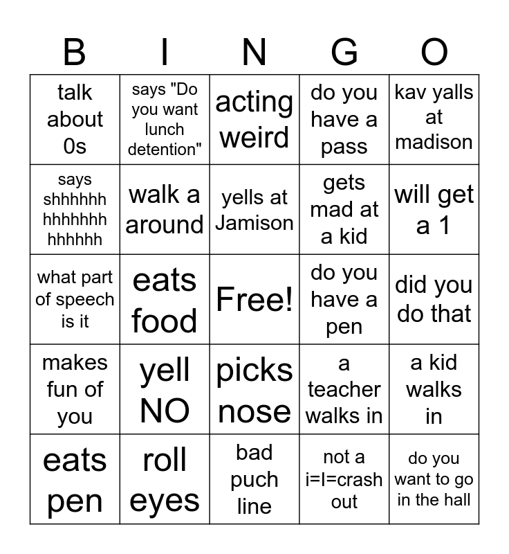 This bingo card has a free space and 24 words: yell NO, roll eyes, yells at Jamison, eats pen, kav yalls at madison, talk about 0s, says shhhhhh hhhhhhh hhhhhh, says "Do you want lunch detention", do you have a pen, picks nose, gets mad at a kid, what part of speech is it, a teacher walks in, a kid walks in, walk a around, not a i=I=crash out, did you do that, acting weird, will get a 1, eats food, do you want to go in the hall, makes fun of you, do you have a pass and bad puch line.