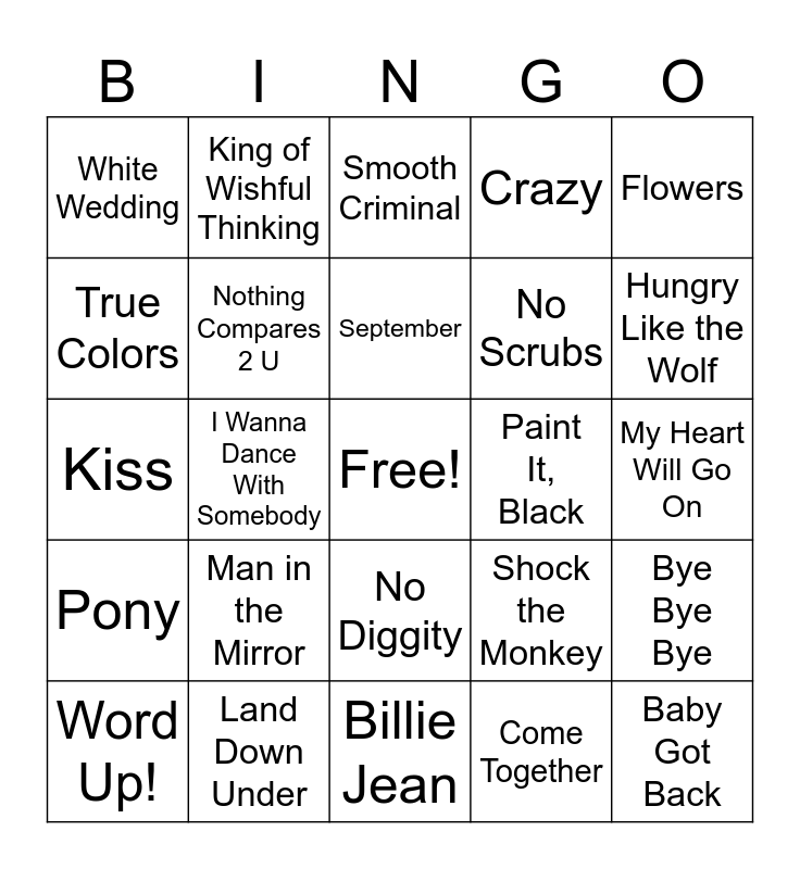 This bingo card has a free space and 45 words: Hey Ya, Baby Got Back, …Baby One More Time, Word Up!, Every Little Thing She Does Is Magic, Come Together, Smooth Criminal, Good Riddance (Time of Your Life), Flowers, Land Down Under, Crazy, Paint It, Black, No Diggity, Man in the Mirror, Poison, Billie Jean, Chandelier, Kiss, Under Pressure, Hungry Like the Wolf, King of Wishful Thinking, Say My Name, The Thunder Rolls, White Wedding, Electric Avenue, My Heart Will Go On, Black Velvet, Ghostbusters, Shock the Monkey, Pony, Good Luck, Babe, Bye Bye Bye, (I Can’t Get No) Satisfaction, Go Your Own Way, Every Breath You Take, I Wanna Dance With Somebody, Just What I Needed, Stayin Alive, Cruel Summer, September, True Colors, No Scrubs, Don’t You (Forget About Me), Nothing Compares 2 U and Happier.