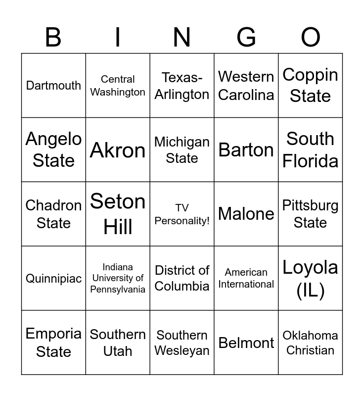 This bingo card has a free space and 649 words: Tuskegee, UNC-Pembroke, Union (TN), University of Charleston, University of Mary, Upper Iowa, Valdosta State, Virginia State, Virginia Union, Virginia-Wise, Walsh, Washburn, Wayne State (MI), Wayne State (NEB), West Alabama, West Chester PA, West Florida, West Liberty, West Texas A&M, West Virginia State, Western Colorado, Western New Mexico, Western Oregon, Western Washington, Westminster (Utah), Wheeling, William Jewell, Wilmington (DE), Wingate, Winona State, Winston-Salem State, Wisconsin-Parkside, WV Wesleyan, Young Harris, Abilene Christian, Air Force, Akron, Alabama, Alabama A&M, Alabama State, Albany, Alcorn State, American University, Appalachian State, Arizona, Arizona State, Arkansas, Arkansas State, Arkansas-Pine Bluff, Army West Point, Auburn, Austin Peay, Ball State, Baylor, Bellarmine, Belmont, Bethune-Cookman, Binghamton, Boise State, Boston College, Boston University, Bowling Green, Bradley, Brigham Young, Brown, Bryant, Bucknell, Buffalo, Butler, Cal Poly, Cal State Bakersfield, Cal State Fullerton, Cal State Northridge, California, California Baptist, Campbell, Canisius, Central Arkansas, Central Connecticut State, Central Michigan, Charleston, Charleston Southern, Charlotte, Chattanooga, Chicago State, Cincinnati, Clemson, Cleveland State, Coastal Carolina, Colgate, Colorado, Colorado State, Columbia, Coppin State, Cornell, Creighton, Dartmouth, Davidson, Dayton, Delaware, Delaware State, Denver, DePaul, Detroit-Mercy, Drake, Drexel, Duke, Duquesne, East Carolina, East Tennessee State, East Texas A&M, Eastern Illinois, Eastern Kentucky, Eastern Michigan, Eastern Washington, Elon, Evansville, Fairfield, Fairleigh Dickinson, Florida, Florida A&M, Florida Atlantic, Florida Gulf Coast, Florida International, Florida State, Fordham, Fort Wayne, Fresno State, Furman, Gardner-Webb, George Mason, George Washington, Georgetown, Georgia, Georgia Southern, Georgia State, Georgia Tech, Gonzaga, Grambling State, Grand Canyon, Green Bay, Hampton, Harvard, Hawaii, High Point, Hofstra, Holy Cross, Houston, Houston Christian, Howard, Idaho, Idaho State, Illinois, Illinois State, Illinois-Chicago, Incarnate Word, Indiana, Indiana State, Iona, Iowa, Iowa State, IU Indy, Jackson State, Jacksonville, Jacksonville State, James Madison, Kansas, Kansas State, Kennesaw State, Kent State, Kentucky, La Salle, Lafayette, Lamar, Le Moyne, Lehigh, Liberty, Lindenwood, Lipscomb, Little Rock, Long Beach State, Long Island, Longwood, Louisiana, Louisiana Tech, Louisiana-Monroe, Louisville, Loyola (IL), Loyola (MD), Loyola Marymount, LSU, Maine, Manhattan, Marist, Marquette, Marshall, Maryland, Maryland-Eastern Shore, Massachusetts, McNeese State, Memphis, Mercer, Mercyhurst, Merrimack College, Miami (FL), Miami (OH), Michigan, Michigan State, Middle Tennessee State, Milwaukee, Minnesota, Mississippi State, Mississippi Valley State, Missouri, Missouri State, Monmouth, Montana, Montana State, Morehead State, Morgan State, Mount St. Mary's, Murray State, N.J.I.T., Navy, NC State, Nebraska, Nevada, New Hampshire, New Haven, New Mexico, New Mexico State, New Orleans, Niagara, Nicholls State, Norfolk State, North Alabama, North Carolina, North Carolina A&T, North Carolina Central, North Dakota, North Dakota State, North Florida, North Texas, Northeastern, Northern Arizona, Northern Colorado, Northern Illinois, Northern Iowa, Northern Kentucky, Northwestern, Northwestern State, Notre Dame, Oakland, Ohio, Ohio State, Oklahoma, Oklahoma State, Old Dominion, Ole Miss, Omaha, Oral Roberts, Oregon, Oregon State, Pacific, Penn State, Pennsylvania, Pepperdine, Pittsburgh, Portland, Portland State, Prairie View A&M, Presbyterian, Princeton, Providence, Purdue, Queens University, Quinnipiac, Radford, Rhode Island, Rice, Richmond, Rider, Robert Morris, Rutgers, Sacramento State, Sacred Heart, Saint Joseph's, Saint Louis, Saint Mary's, Saint Peter's, Sam Houston State, Samford, San Diego, San Diego State, San Francisco, San Jose State, Santa Clara, Seattle, Seton Hall, Siena, SIU-Edwardsville, South Alabama, South Carolina, South Carolina State, South Dakota, South Dakota State, South Florida, Southeast Missouri State, Southeastern Louisiana, Southern, Southern Illinois, Southern Indiana, Southern Methodist, Southern Mississippi, Southern Utah, St. Bonaventure, St. Francis (PA), St. John's, St. Thomas, Stanford, Stephen F. Austin, Stetson, Stonehill, Stony Brook, Syracuse, Tarleton State, TCU, Temple, Tennessee, Tennessee State, Tennessee Tech, Tennessee-Martin, Texas, Texas A&M, Texas A&M-CC, Texas Southern, Texas State, Texas Tech, Texas-Arlington, Texas-RGV, Texas-San Antonio, The Citadel, Toledo, Towson, Troy, Tulane, Tulsa, UAB, UC Davis, UC Irvine, UC Riverside, UC San Diego, UC Santa Barbara, UCF, UCLA, UConn, UMass Lowell, UMBC, UMKC, UNC Asheville, UNC Greensboro, UNC Wilmington, UNLV, USC, USC Upstate, Utah, Utah State, Utah Tech, Utah Valley, UTEP, Valparaiso, Vanderbilt, VCU, Vermont, Villanova, Virginia, Virginia Military, Virginia Tech, Wagner, Wake Forest, Washington, Washington State, Weber State, West Georgia, West Virginia, Western Carolina, Western Illinois, Western Kentucky, Western Michigan, Wichita State, William & Mary, Winthrop, Wisconsin, Wofford, Wright State, Wyoming, Xavier, Yale, Youngstown State, Adams State, Adelphi, Alabama-Huntsville, Alaska - Anchorage, Alaska - Fairbanks, Albany State (GA), American International, Anderson (SC), Angelo State, Arkansas Tech, Arkansas-Fort Smith, Arkansas-Monticello, Ashland, Assumption College, Auburn-Montgomery, Augusta University, Augustana College, Azusa Pacific, Barry, Barton, Belmont Abbey, Bemidji State, Benedict College, Bentley, Biola, Black Hills State, Bloomsburg, Bluefield State, Bowie State, Bridgeport, Cal Poly - Pomona, Cal Poly Humboldt, Cal State Dominguez Hills, Cal State East Bay, Cal State Los Angeles, Cal State Monterey Bay, Cal State San Bernardino, Cal State San Marcos, Caldwell, Ca
