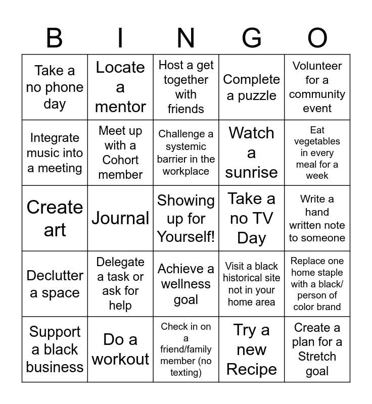 This bingo card has a free space and 35 words: Read a recommended book, Take a nature walk, Visit a black art exhibit, Meet up with a Cohort member, Achieve a wellness goal, Complete a puzzle, Integrate music into a meeting, Purchase/ Grow a plant, Challenge a systemic barrier in the workplace, Do Yoga/meditation in the park, Create art, Volunteer for a community event, Attend a Sugar Sharing Session, Invite a friend/colleague to aSugar Sharing Series, Take a no phone day, Take a no TV Day, Try a new Recipe, Journal, Declutter a space, Create a plan for a Stretch goal, Visit a black historical site not in your home area, Support a black business, Replace one home staple with a black/ person of color brand, Do a workout, Host a get together with friends, Eat vegetables in every meal for a week, Eat lunch away from te office, Get 8 full hours of sleep, Watch a sunrise, Write a hand written note to someone, Say no to something that you typically find hard saying no to, Check in on a friend/family member (no texting), Delegate a task or ask for help, Locate a mentor and Change a harmful work habit.