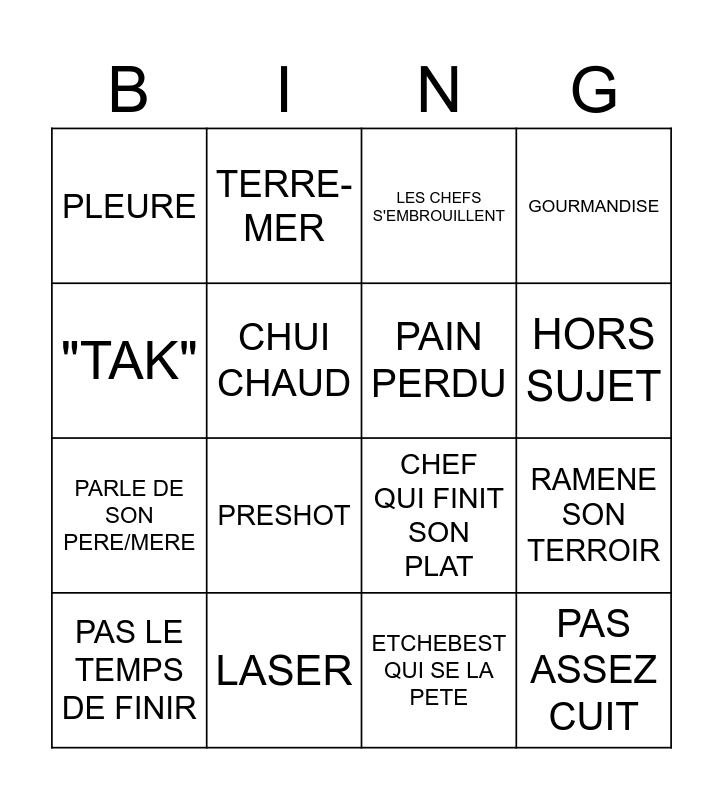 This bingo card has 16 words: LASER, RAMENE SON TERROIR, LES CHEFS S'EMBROUILLENT, PLEURE, PARLE DE SON PERE/MERE, TERRE-MER, CHEF QUI FINIT SON PLAT, ETCHEBEST QUI SE LA PETE, "TAK", CHUI CHAUD, PAS LE TEMPS DE FINIR, GOURMANDISE, PRESHOT, HORS SUJET, PAIN PERDU and PAS ASSEZ CUIT.