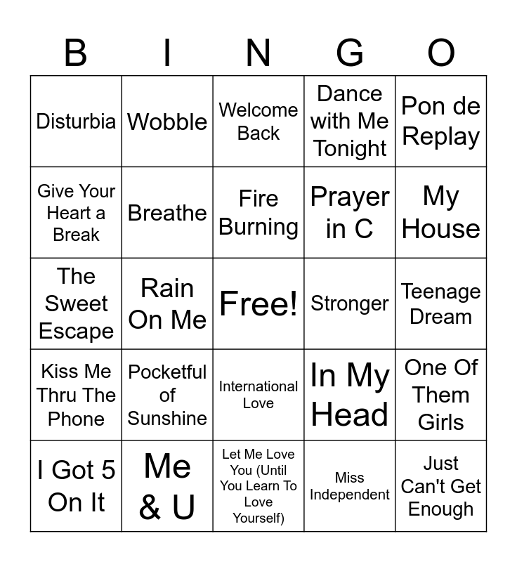 This bingo card has a free space and 60 words: Love in This Club, Me & U, No One, Kiss Me Thru The Phone, Miss Independent, Closer, Breathe, Domino, Prayer in C, You Make Me Feel..., Dance with Me Tonight, Just a Dream, Give Your Heart a Break, Ocean Drive, It's Not Unusual, Disturbia, Just Can't Get Enough, Pon de Replay, SOS, Fire Burning, Stronger, Welcome Back, I Got 5 On It, One Of Them Girls, Ain't No Love in Oklahoma, Bartender, Magic, Pretty Girl Rock, My House, Tonight Tonight, Summertime, I Like That, Carry Out, Say Aah, Wobble, Rock That Body, Rock This Party (Everybody Dance Now), Rain On Me, Wild Ones, The Sweet Escape, Break Your Heart, Pocketful of Sunshine, Teenage Dream, Good Feeling, In My Head, We Can't Stop, Part Of Me, Summer Love, Scream, International Love, Let Me Love You (Until You Learn To Love Yourself), Am I Wrong, I Like It, Latch, Love You Like A Love Song, Come & Get It, Habits (Stay High), Beauty And A Beat, Boyfriend and Get Up.