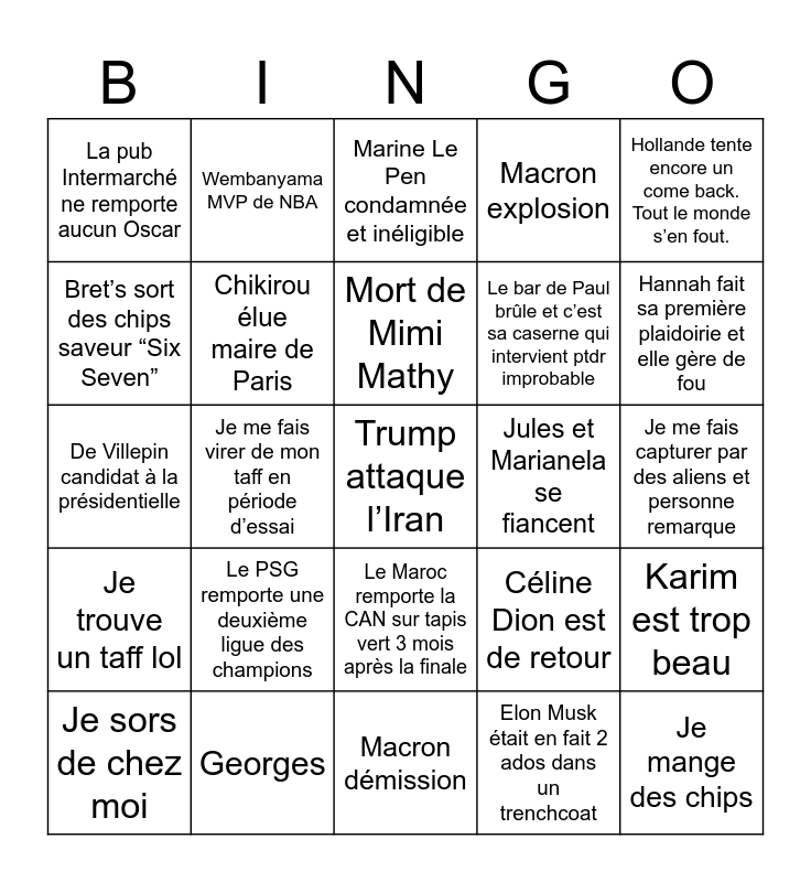 This bingo card has a free space and 24 words: Je sors de chez moi, Le PSG remporte une deuxième ligue des champions, Mort de Mimi Mathy, Elon Musk était en fait 2 ados dans un trenchcoat, Hollande tente encore un come back. Tout le monde s’en fout., La pub Intermarché ne remporte aucun Oscar, Wembanyama MVP de NBA, Marine Le Pen condamnée et inéligible, Jules et Marianela se fiancent, Je me fais capturer par des aliens et personne remarque, De Villepin candidat à la présidentielle, Chikirou élue maire de Paris, Céline Dion est de retour, Karim est trop beau, Bret’s sort des chips saveur “Six Seven”, Georges, Macron démission, Macron explosion, Hannah fait sa première plaidoirie et elle gère de fou, Je trouve un taff lol, Je me fais virer de mon taff en période d’essai, Le Maroc remporte la CAN sur tapis vert 3 mois après la finale, Le bar de Paul brûle et c’est sa caserne qui intervient ptdr improbable and Je mange des chips.
