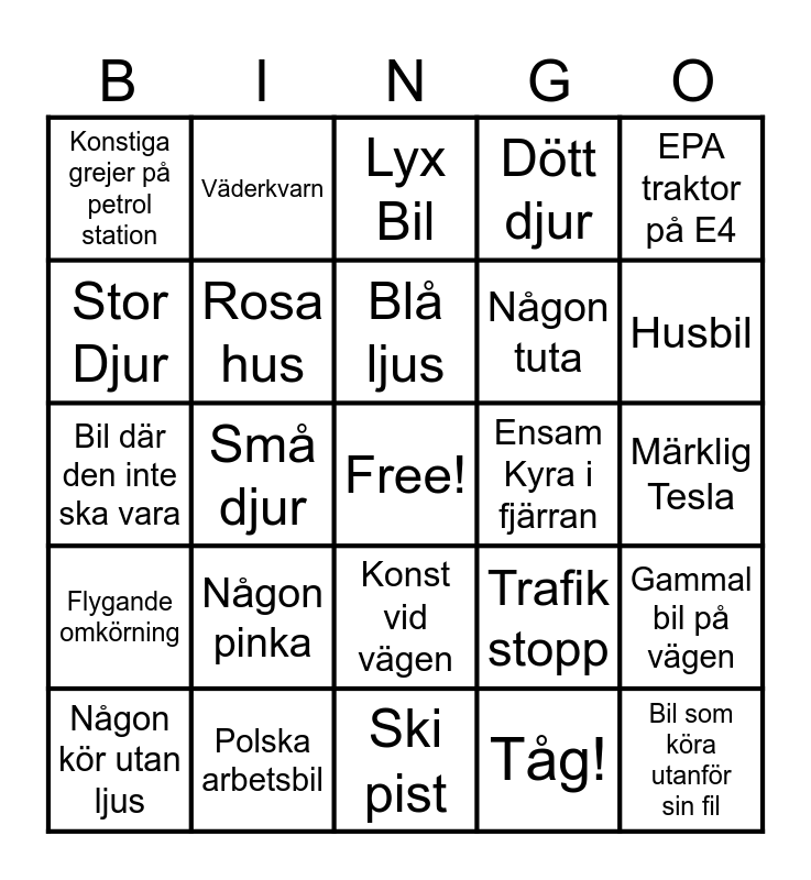 This bingo card has a free space and 24 words: Någon pinka, Polska arbetsbil, Blå ljus, Någon kör utan ljus, EPA traktor på E4, Konstiga grejer på petrol station, Stor Djur, Väderkvarn, Ensam Kyra i fjärran, Konst vid vägen, Någon tuta, Bil där den inte ska vara, Trafik stopp, Gammal bil på vägen, Rosa hus, Tåg!, Märklig Tesla, Lyx Bil, Husbil, Små djur, Bil som köra utanför sin fil, Flygande omkörning, Dött djur and Ski pist.