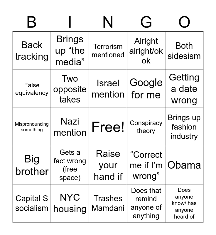 This bingo card has a free space and 25 words: Gets a fact wrong (free space), Trashes Mamdani, Israel mention, Capital S socialism, Both sidesism, Back tracking, False equivalency, Brings up “the media”, Conspiracy theory, Raise your hand if, Google for me, Mispronouncing something, “Correct me if I’m wrong”, Obama, Two opposite takes, Advertises a new site, Brings up fashion industry, Terrorism mentioned, Getting a date wrong, Nazi mention, Does anyone know/ has anyone heard of, NYC housing, Big brother, Alright alright/ok ok and Does that remind anyone of anything.