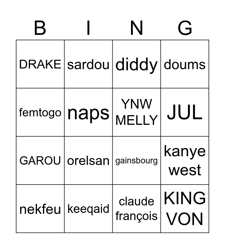 This bingo card has 16 words: keeqaid, kanye west, diddy, DRAKE, GAROU, sardou, gainsbourg, claude françois, femtogo, naps, nekfeu, doums, orelsan, JUL, YNW MELLY and KING VON.