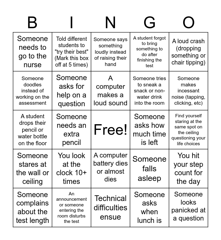 This bingo card has a free space and 31 words: Technical difficulties ensue, Someone submits before half the time is up, Someone needs an extra pencil, Someone asks to use the restroom, Someone needs to go to the nurse, Someone says something loudly instead of raising their hand, Someone asks for help on a question, Someone falls asleep, Someone asks how much time is left, Someone asks when lunch is, Find yourself staring at the same spot on the ceiling questioning your life choices, Someone looks panicked at a question, Someone exclaims how easy a question is, You check the clock and it's only been 5 minutes.. How is that possible?!?, Someone makes incessant noise (tapping, clicking, etc), A student coughs and sneezes 5+ times, You hit your step count for the day, You look at the clock 10+ times, Someone stares at the wall or ceiling, A computer battery dies or almost dies, A loud crash (dropping something or chair tipping), You have to give "the look" more than once to a student, Someone complains about the test length, Told different students to "try their best" (Mark this box off at 5 times), Someone tries to sneak a snack or non-water drink into the room, Someone doodles instead of working on the assessment, A student forgot to bring something to do after finishing the test, A student drops their pencil or water bottle on the floor, An announcement or someone entering the room disturbs the test, A computer makes a loud sound and A student is wearing headphones when they aren't needed.