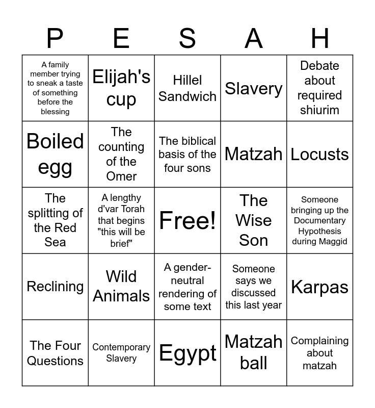 This bingo card has a free space and 28 words: Karpas, Maror, Matzah, Matzah ball, Boiled egg, Hillel Sandwich, Elijah's cup, Reclining, The Wise Son, The Four Questions, The splitting of the Red Sea, Slavery, Contemporary Slavery, Egypt, Locusts, Boils, Wild Animals, The counting of the Omer, The biblical basis of the four sons, A gender-neutral rendering of some text, A family member trying to sneak a taste of something before the blessing, Someone saying "next year in Jerusalem" but not actually planning to go, Complaining about matzah, A lengthy d'var Torah that begins "this will be brief", Someone bringing up the Documentary Hypothesis during Maggid, Someone says we discussed this last year, Debate about required shiurim and Something untraditional.