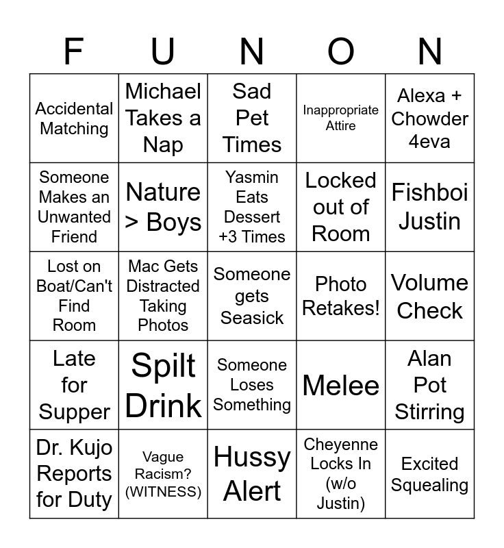 This bingo card has a free space and 24 words: Spilt Drink, Vague Racism? (WITNESS), Yasmin Eats Dessert +3 Times, Dr. Kujo Reports for Duty, Alexa + Chowder 4eva, Accidental Matching, Someone Makes an Unwanted Friend, Michael Takes a Nap, Photo Retakes!, Someone Loses Something, Locked out of Room, Lost on Boat/Can't Find Room, Melee, Alan Pot Stirring, Nature > Boys, Cheyenne Locks In (w/o Justin), Volume Check, Sad Pet Times, Fishboi Justin, Mac Gets Distracted Taking Photos, Excited Squealing, Late for Supper, Inappropriate Attire and Hussy Alert.