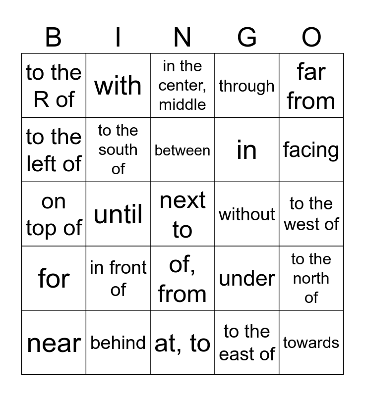 This bingo card has a free space and 24 words: in front of, behind, between, near, far from, to the R of, to the left of, with, without, of, from, in, on top of, under, to the north of, to the south of, to the east of, to the west of, in the center, middle, facing, until, towards, for, through and at, to.