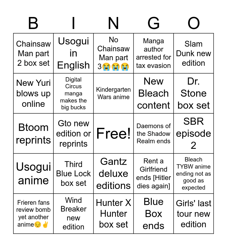 This bingo card has a free space and 24 words: Third Blue Lock box set, Wind Breaker new edition, Kindergarten Wars anime, Frieren fans review bomb yet another anime😔✌️, Slam Dunk new edition, Chainsaw Man part 2 box set, New Yuri blows up online, Usogui in English, Daemons of the Shadow Realm ends, Gantz deluxe editions, New Bleach content, Btoom reprints, Rent a Girlfriend ends [Hitler dies again], Bleach TYBW anime ending not as good as expected, Digital Circus manga makes the big bucks, Blue Box ends, SBR episode 2, No Chainsaw Man part 3😭😭😭, Dr. Stone box set, Gto new edition or reprints, Girls' last tour new edition, Usogui anime, Manga author arrested for tax evasion and Hunter X Hunter box set.