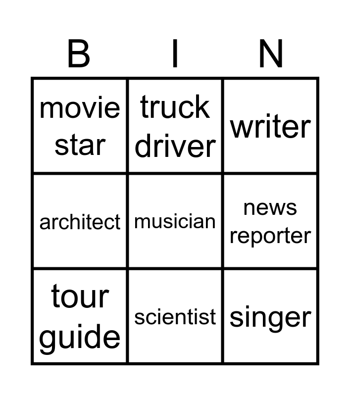 This bingo card has 12 words: astronaut, singer, musician, news reporter, truck driver, writer, scientist, engineer, movie star, architect, tour guide and delivery person.