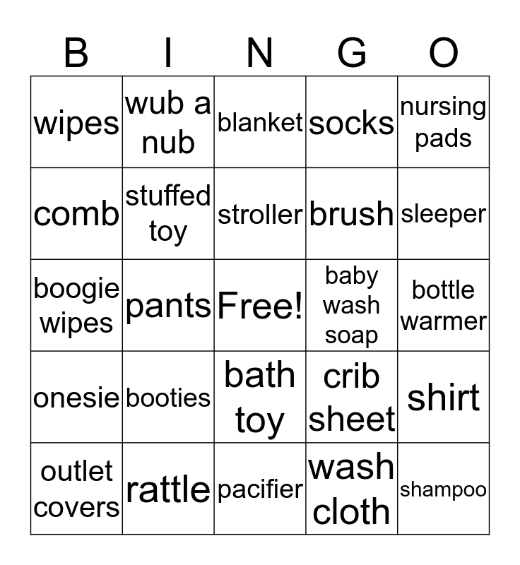 This bingo card has a free space and 30 words: rattle, mobile, pants, diapers, wipes, blanket, stuffed toy, bath toy, baby wash soap, pacifier, bottle warmer, shampoo, wash cloth, towel, sleeper, pillow, crib sheet, onesie, booties, nursing pads, boogie wipes, milk storage bags, wub a nub, brush, comb, socks, shirt, outlet covers, stroller and bumper pads.