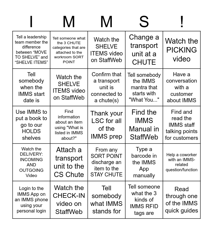 This bingo card has a free space and 24 words: Attach a transport unit to the CS Chute, Watch the CHECK-IN video on StaffWeb, Confirm that a transport unit is connected to a chute(s), Login to the IMMS App on an IMMS phone using your personal login, Watch the PICKING video, Tell a leadership team member the difference between “MOVE TO SHELVE” and “SHELVE ITEMS”, Tell somebody when the IMMS start date is, Tell someone what the 3 CHUTE categories that are attached to the workroom SORT POINT, Find the IMMS Manual in StaffWeb, From any SORT POINT discharge an item to the STAY CHUTE, Tell somebody the IMMS mantra that starts with "What You...", Use IMMS to put a book to go to our HOLDS shelves, Type a barcode in the IMMS App manually, Help a coworker with an IMMS-related question/function, Watch the SHELVE ITEMS video on StaffWeb, Tell someone what the 3 kinds of IMMS RFID tags are, Find and read the IMMS staff talking points for customers, Watch the SHELVE ITEMS video on StaffWeb, Have a conversation with a customer about IMMS, Find information about an item using "What is listed in IMMS about?", Read through one of the IMMS quick guides, Watch the DELIVERY: INCOMING AND OUTGOING Video, Change a transport unit at a CHUTE and Tell somebody what IMMS stands for.