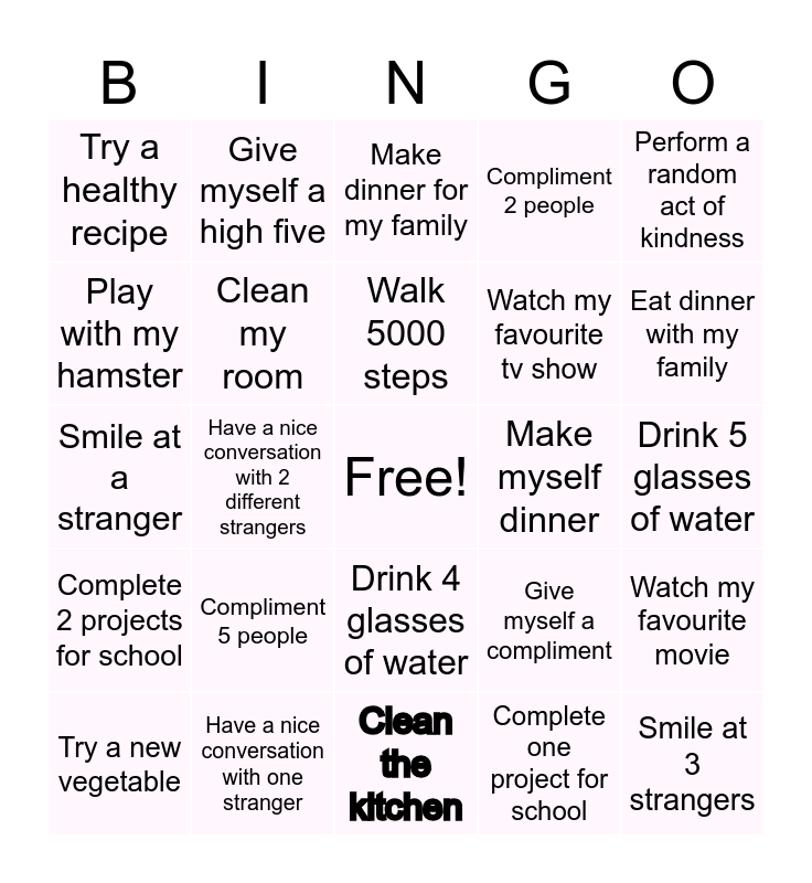 This bingo card has a free space and 24 words: Compliment 5 people, Have a nice conversation with one stranger, Walk 5000 steps, Try a new vegetable, Perform a random act of kindness, Try a healthy recipe, Play with my hamster, Give myself a high five, Make myself dinner, Drink 4 glasses of water, Watch my favourite tv show, Smile at a stranger, Give myself a compliment, Watch my favourite movie, Clean my room, Complete one project for school, Drink 5 glasses of water, Make dinner for my family, Eat dinner with my family, Have a nice conversation with 2 different strangers, Smile at 3 strangers, Complete 2 projects for school, Compliment 2 people and Clean the kitchen.