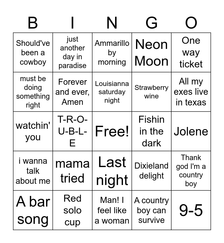 This bingo card has a free space and 55 words: Choosin' Texas, A bar song, Tennessee Whiskey, Should've been a cowboy, Man! I feel like a woman, Check yes or no, Forever and ever, Amen, Head Carolina, Tails California, Strawberry wine, She's in love with the boy, Neon Moon, Cowboy take me away, Maybe it was Memphis, paint me a Birmingham, I like it, I love it, Watermelon crawl, One way ticket, T-R-O-U-B-L-E, Butterfly Kisses, 9-5, Fishin in the dark, boot scootin boogie, Dixieland delight, Ammarillo by morning, Copperhead road, Louisianna saturday night, A country boy can survive, Coal Miners Daughter, Jolene, Thank god I'm a country boy, Take me home, Country road, suds in a bucket, gunpowder and lead, big green tractor, must be doing something right, watchin' you, red high heels, i wanna talk about me, mr mom, she thinks my tractors sexy, just another day in paradise, it's five o'clock somewhere, the devil went down to Georgia, sweet home Alabama, mama tried, Red solo cup, Hey good lookin, Mamas don't let their babies grow up to be cowboys, as good as I once was, All my exes live in texas, Drinkin problem, love somebody, Fast Car, Last night and One man band.