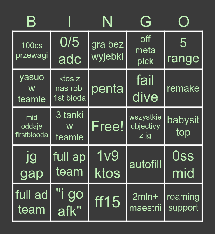 This bingo card has a free space and 24 words: full ad team, full ap team, penta, 2mln+ maestrii, 5 range, 100cs przewagi, 0/5 adc, gra bez wyjebki, wszystkie objectivy z jg, babysit top, mid oddaje firstblooda, ktos z nas robi 1st bloda, autofill, 0ss mid, yasuo w teamie, "i go afk", ff15, off meta pick, remake, jg gap, 3 tanki w teamie, 1v9 ktos, fail dive and roaming support.