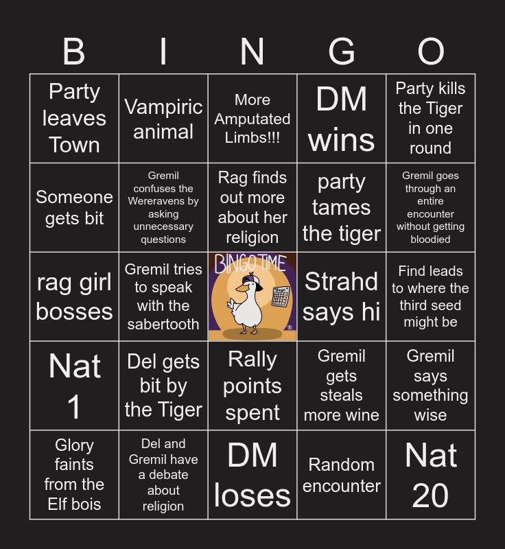 This bingo card has a free space and 24 words: Del gets bit by the Tiger, Del and Gremil have a debate about religion, Rag finds out more about her religion, Glory faints from the Elf bois, Party kills the Tiger in one round, Party leaves Town, Someone gets bit, Vampiric animal, Strahd says hi, Rally points spent, party tames the tiger, rag girl bosses, Gremil gets steals more wine, Gremil says something wise, Gremil confuses the Wereravens by asking unnecessary questions, Random encounter, Find leads to where the third seed might be, More Amputated Limbs!!!, Gremil goes through an entire encounter without getting bloodied, Gremil tries to speak with the sabertooth, Nat 20, Nat 1, DM wins and DM loses.
