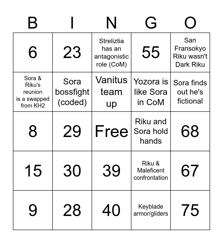 This bingo card has a free space and 75 words: Amnesiac Sora, Job minigames (KH2), Streliztia has an antagonistic role (CoM), Sora fistfights someone, Sora thanks Naminé, Split gameplay (DDD), Kairi & Aqua focused interludes, Dress up mechanic (0.2), Keyblade armor/gliders, Sora & Luxord just being guys, Young Xehanort is there, Riku cries, Riku and Sora hold hands, Sora finds out he's fictional, Riku does an Akira slide, Sora bossfight (coded), Plot Important Necklaces, Riku & Maleficent confrontation, Yozora does the Riku Pose, Sora & Riku's reunion is a swapped from KH2, Repliku finds WttD, Vanitus team up, Yozora is like Sora in CoM, San Fransokyo Riku wasn't Dark Riku, 6, 21, 35, 51, 66, 7, 22, 36, 52, 67, 8, 23, 37, 53, 68, 9, 24, 38, 54, 69, 10, 25, 39, 55, 70, 11, 26, 40, 56, 71, 12, 27, 41, 57, 72, 13, 28, 42, 58, 73, 14, 29, 43, 59, 74, 15, 30, 44, 60, 75 and 45.